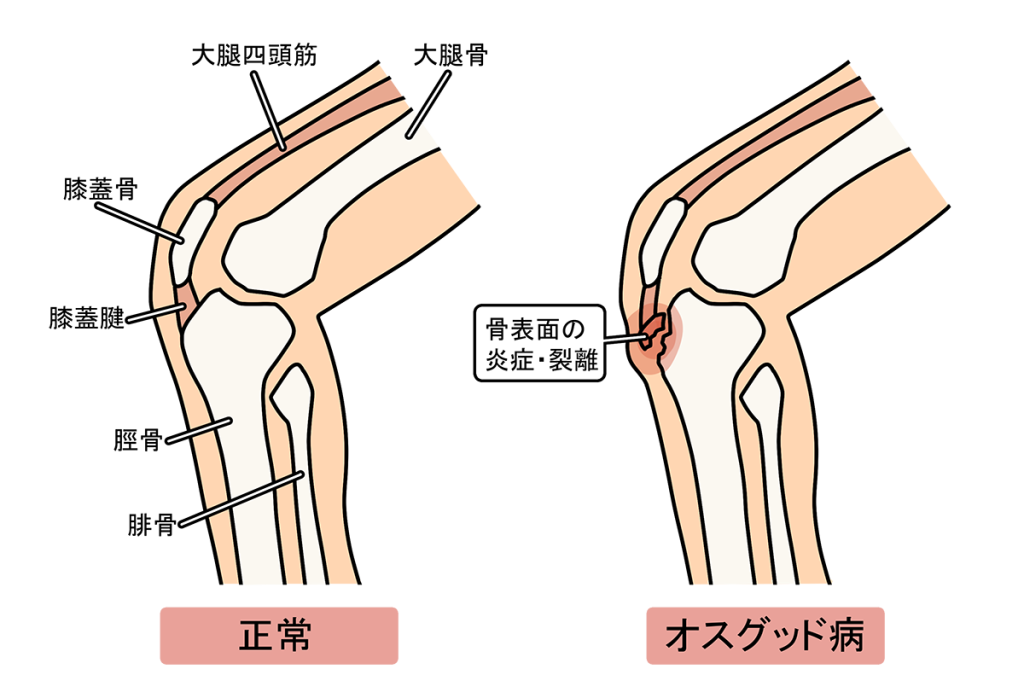 ジャンパー膝と呼ばれることもあるこの状態は、通常、青年期に発生します。部活などで膝蓋腱に繰り返し負荷をかけるハードなスポーツを行うと、オスグッドになることがあります。ランニングやジャンプなどの特定のアクティビティによって、脚の筋肉が膝蓋腱を引っ張る原因となり、成長板が引っ張られます